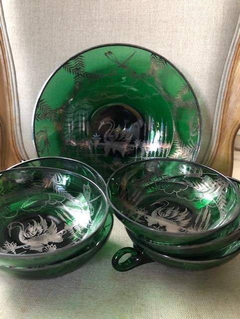 Set Of 6 Large Cups And 1 Bowl In Green Glasswork With Silver